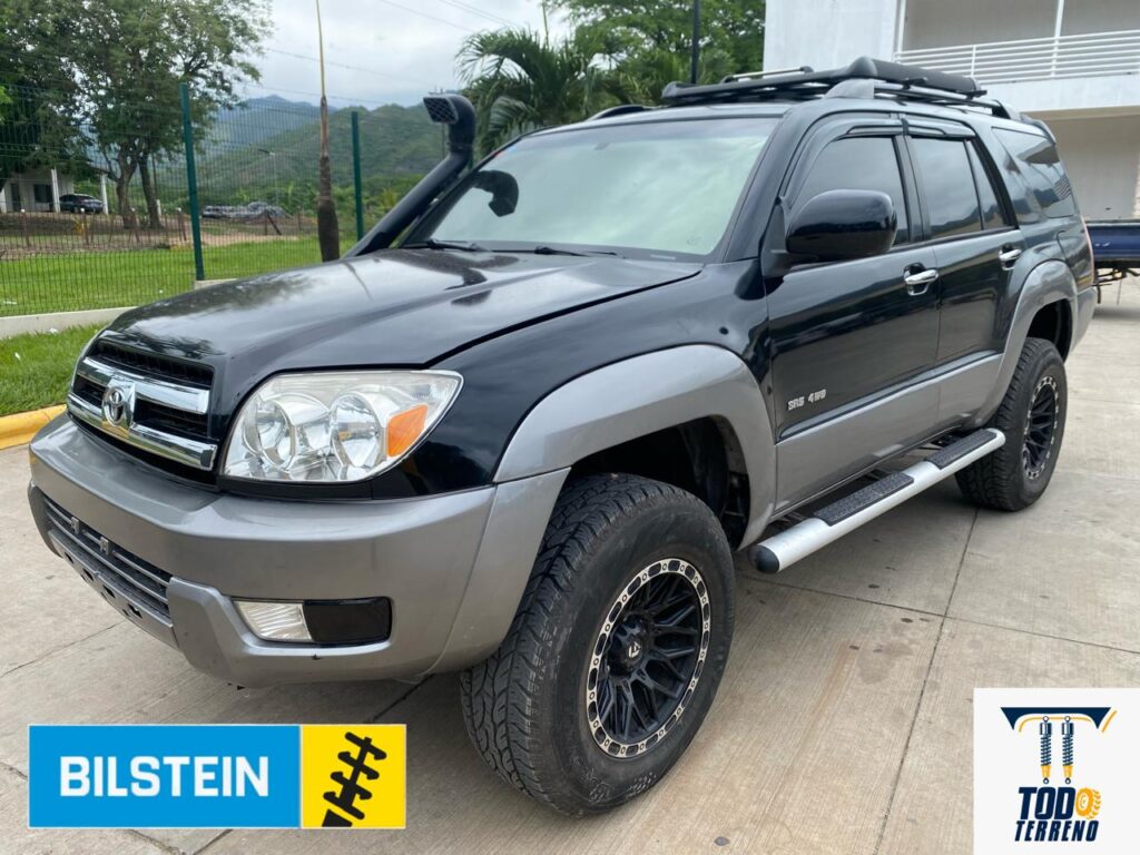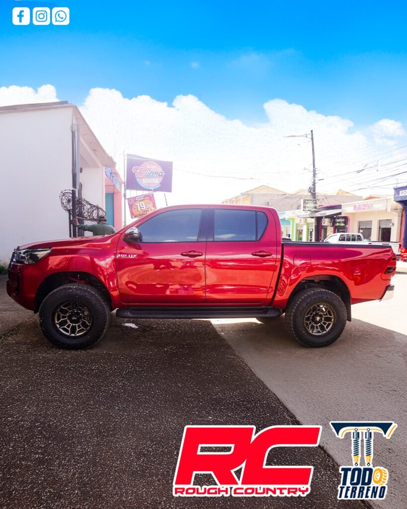 Instalación de suspensión Rough Country de 4” para mayor altura, mejor desempeño off-road y una apariencia más robusta.